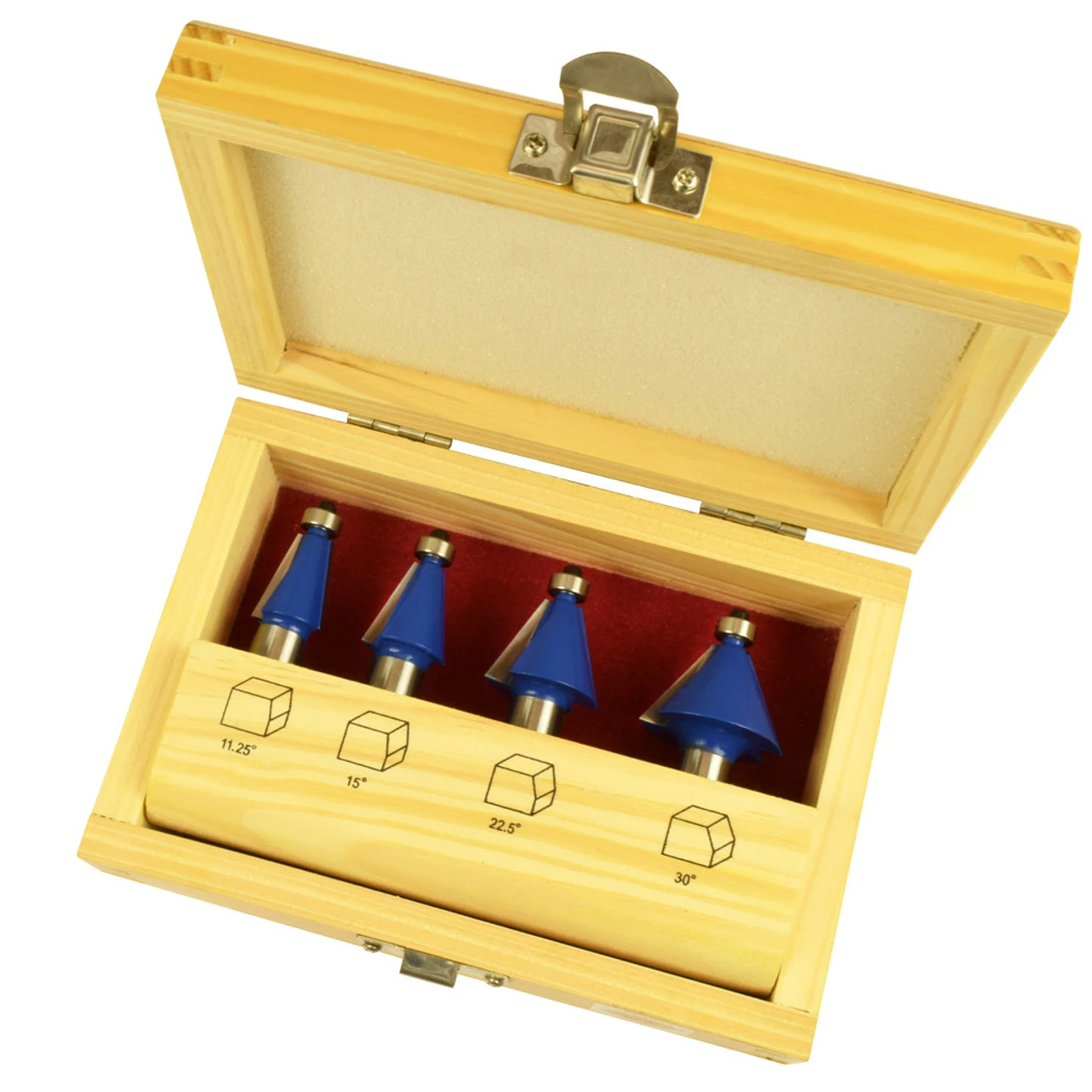 This set of four bits create chamfers and bevels on edges that can ease the corners or provide a decorative element. As well, the 15-degree bit can be used to create 12 sided boxes, the 22.5-degree bit will create octagonal boxes, the 30-degree bit will create hexagonal boxes and the 11.25-degree bit will create 16 sided boxes.