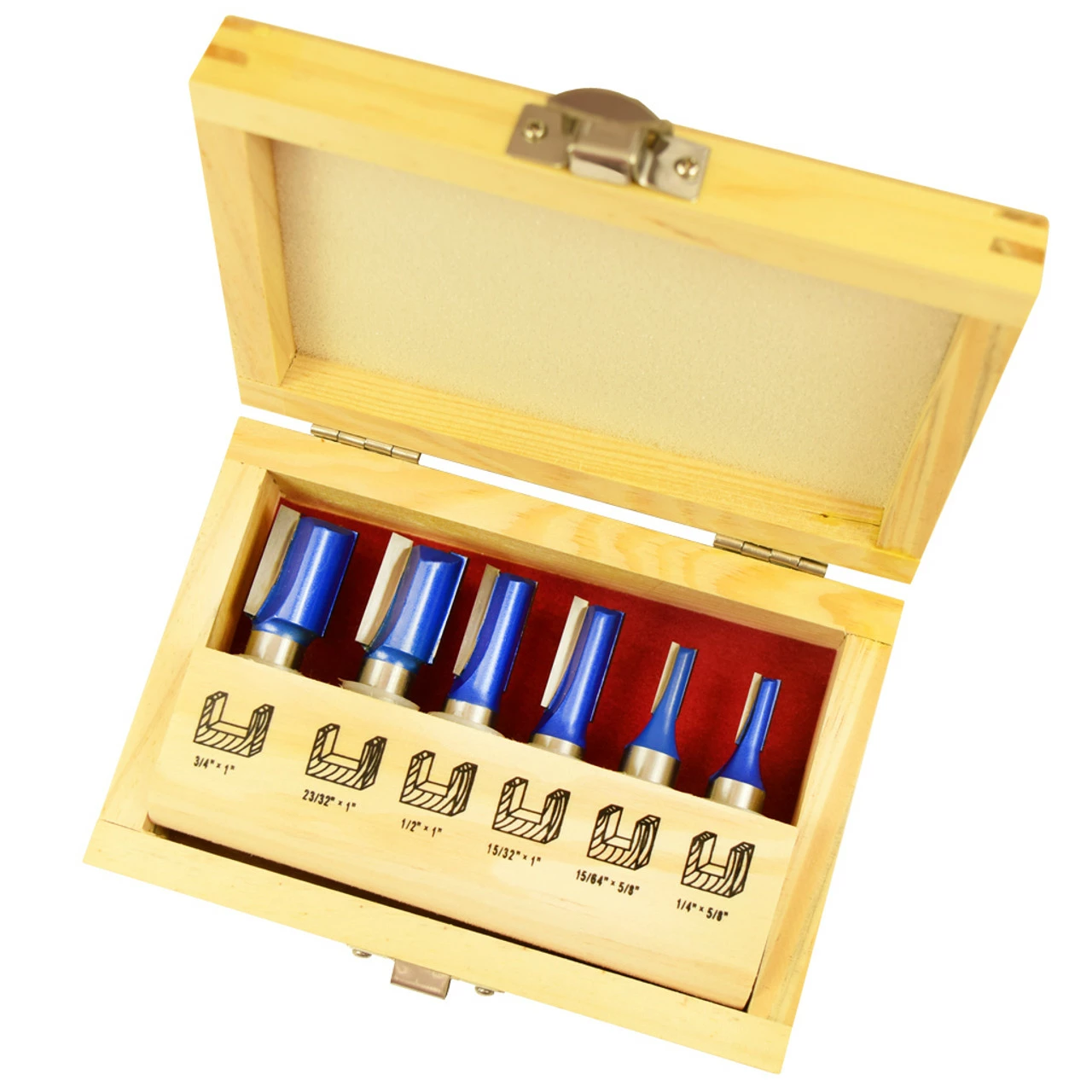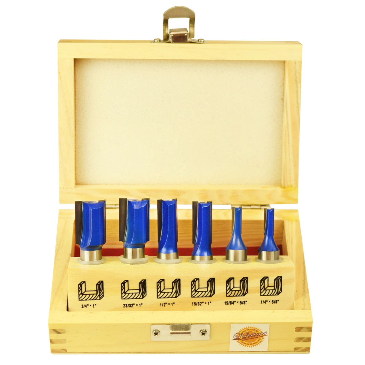 This set of six straight bits is ideal for cutting dadoes, rabbets and other general cutting needs. The set includes regular and undersized bits making it handy for working with commercial plywood. The set includes the following widths: 15/64″, 1/4″, 15/32″, 1/2″, 23/32″, and 3/4″. The bits come housed in a wooden box so that they are always together and ready when you want