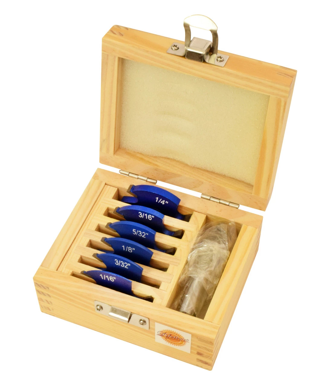 This set has six different slot cutters ranging from 1/16″ to 1/4″. Simply fit the desired slot cutter onto the arbor provided and cut your groove. The cutter sizes included are: 1/16″, 3/32″, 1/8″, 5/32″, 3/16″, and 1/4″. The bits come housed in a wooden box so that they are always together and ready when you want to work