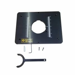 Our 1/4″ thick aluminum router table insert will support the heaviest of routers, without plate sag. The plate is about 9″ x 12″ and includes levelling screws and magnets to secure the plate in the table. Includes three separate insert rings with attaching screws which provide opening sizes (3-1/4″, 1-7/16″, 1-3/16″ for template guides and a blank insert ring to create your own size). The steel starter pin is for routing curved pieces. Pre-marked mounting hole indentations provided for most popular routers.