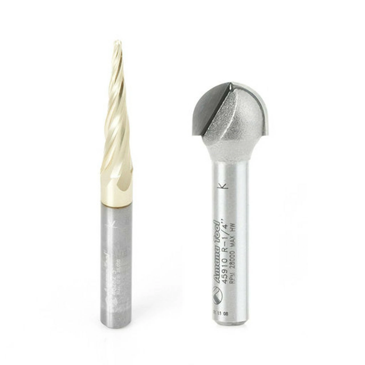 The Axiom ABS-203 Carving Bit exclusively designed for our Iconic series machines with 1/4″ shank Set provides everything you need to produce clean, highly detailed 3D carvings. The 1/4″ radius core box bit is ideal for quickly removing large amounts of material during roughing applications. The 1/16″ tapered ball nose bit can produce a glass-smooth surface yet offers crisp, highly-detailed detail reproduction of complex 3D models.