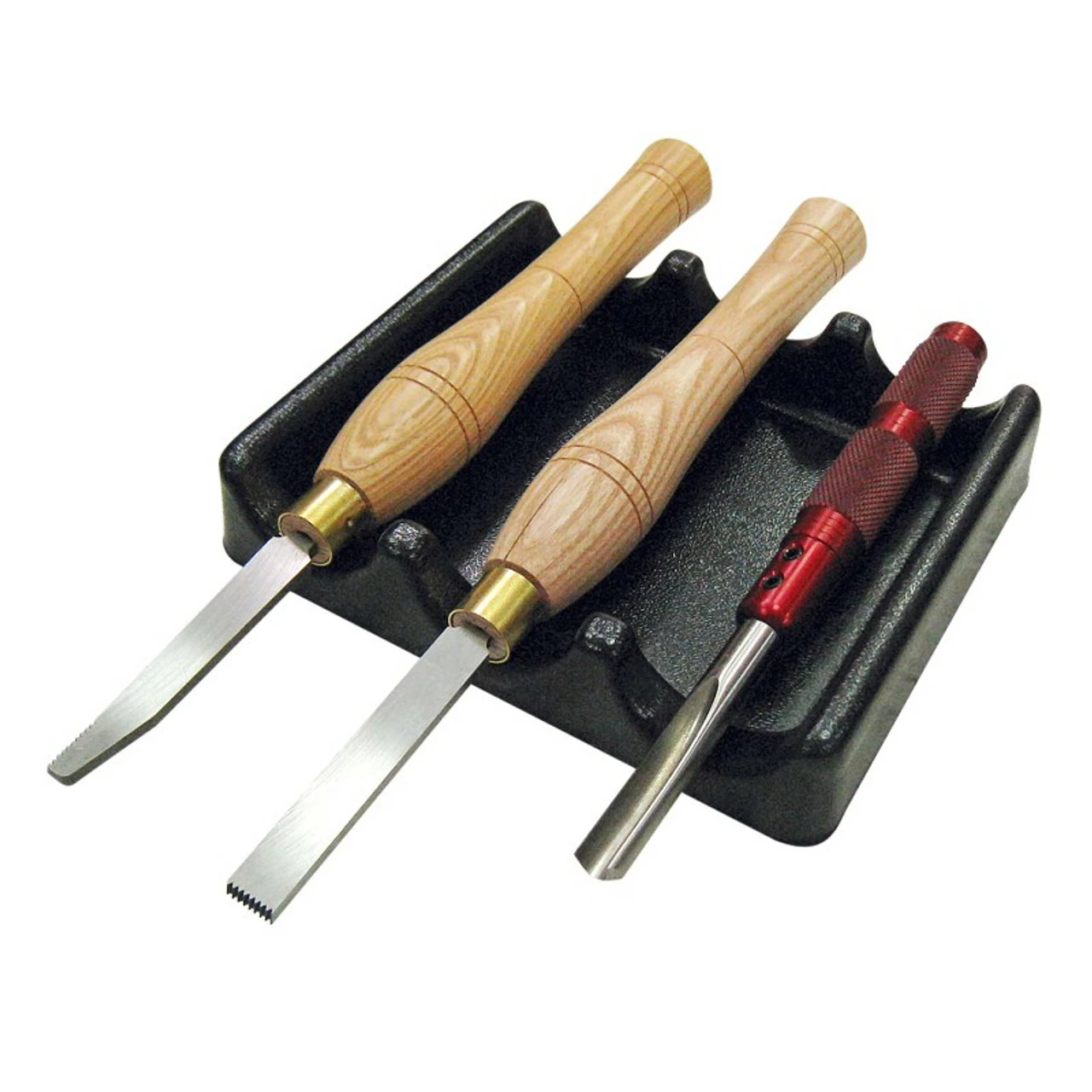 If you have ever reached for a tool on your lathe bed only to have it roll away or even worse, fall to the floor, then you know how frustrating it can be. With the Magnetic Base Tool Tray, your “roll away” tools are no more. The tray is secured with a strong magnetic base and it can be repositioned and adjusted quickly and easily. The Magnetic Base Tool Tray will not shimmy or vibrate loose. You can place up to 3 turning tools on the rack for easy access while turning. The tray will work with any lathe with a cast iron or steel lathe bed.