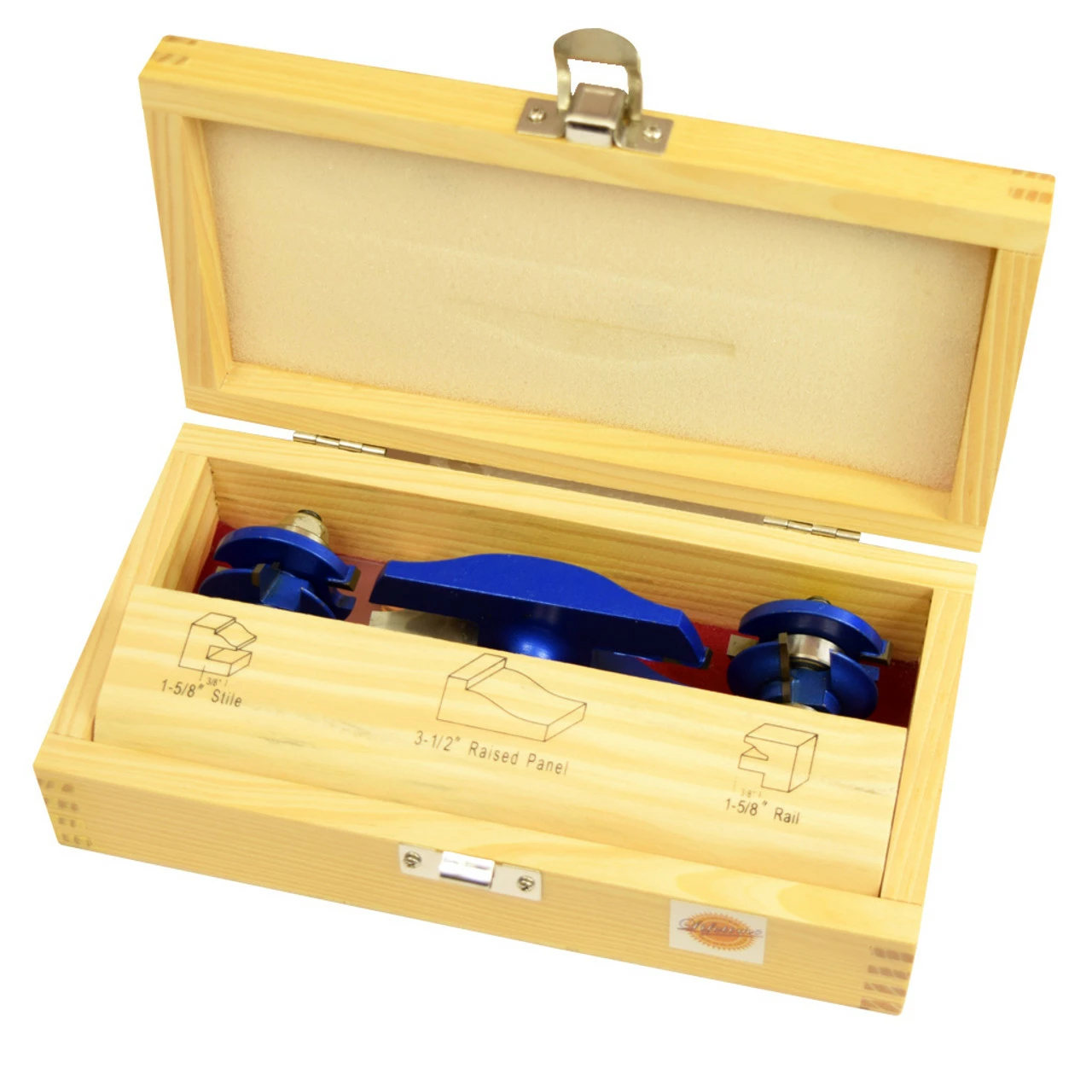 This complete set of three bits allows you to cut both the rails and stiles, as well as the panel to make a raised panel door. The bits come housed in a wooden box so that they are always together and ready when you want to work.