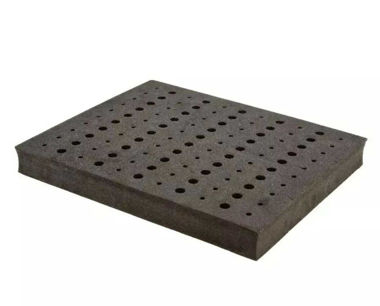 Router Bit Tray stores and organizes up to 100 bits, with 50 holes each for 1/2″ & 1/4″ shanks. (1/4″ holes accept 8mm shanks as well.) Stiff foam slab is 12-1/4″ square x 1-1/2″ thick. Holes are on 1″ centers.