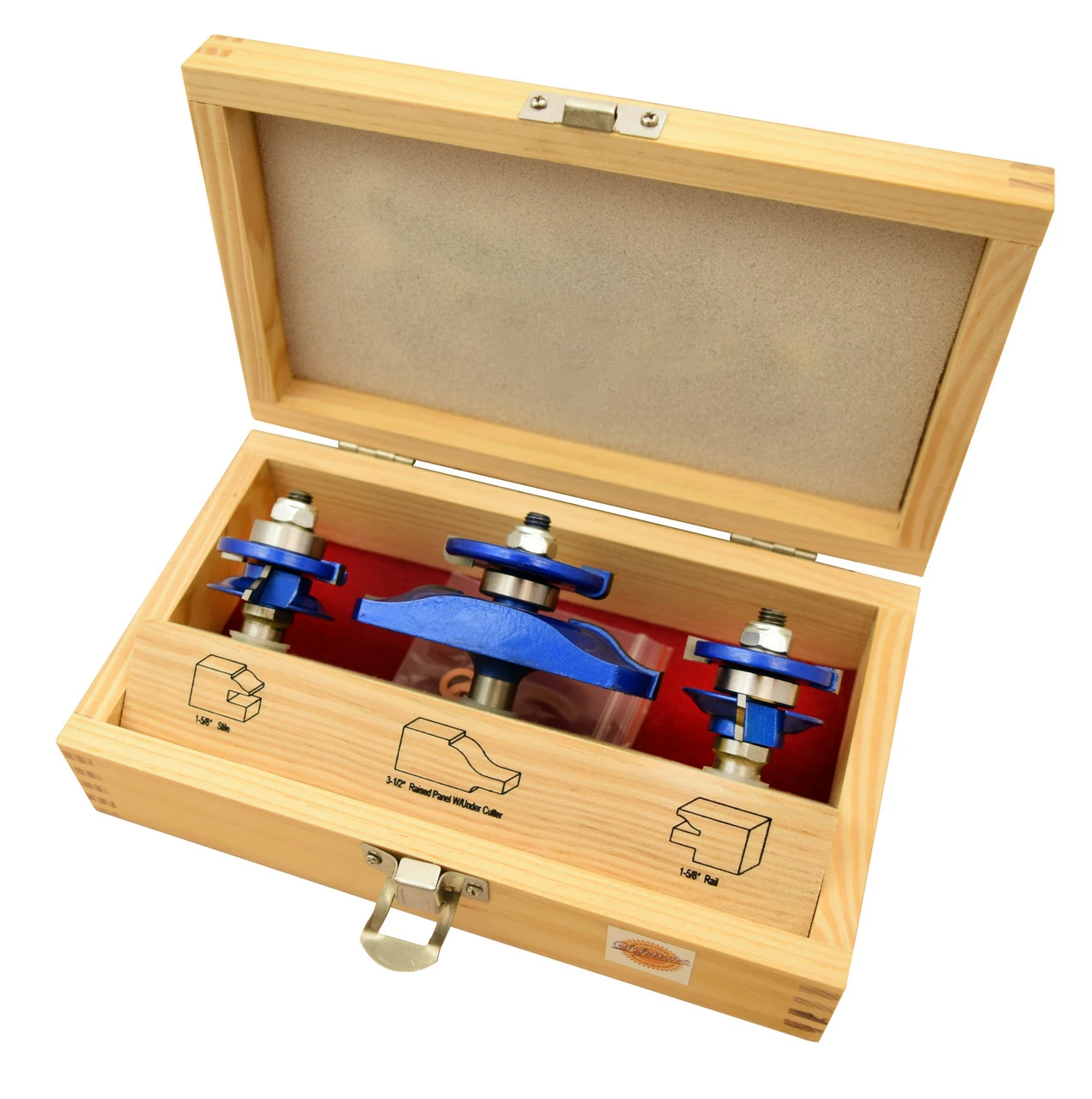 This complete set of three bits allows you to cut both the rails and stiles, as well as the panel to make a raised panel door. The bits come housed in a wooden box so that they are always together and ready when you want to work.